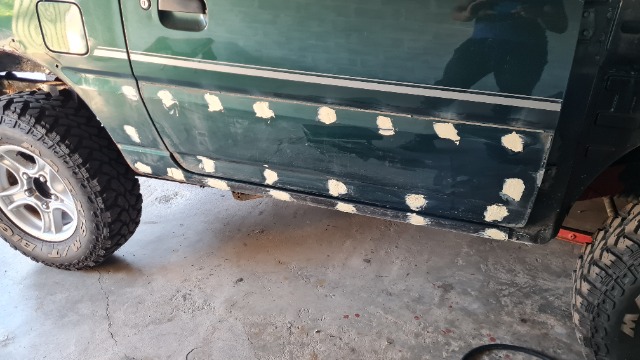 After speaking with Keith, I've got a full set of his unique arches on the way to replace the stock trim. So, the past few days I've been filling the holes on the door and fixing some bad rust on the front wings (where they connect to the body at the bottom).
