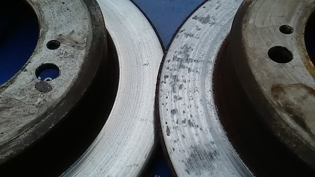 Finally today started to fit my new EBC disks and pads. The one being removed have just over 30k of very light use, but for sometime they have felt warped. You can see the problem in the surface of one, result of something else or just poor quality control?