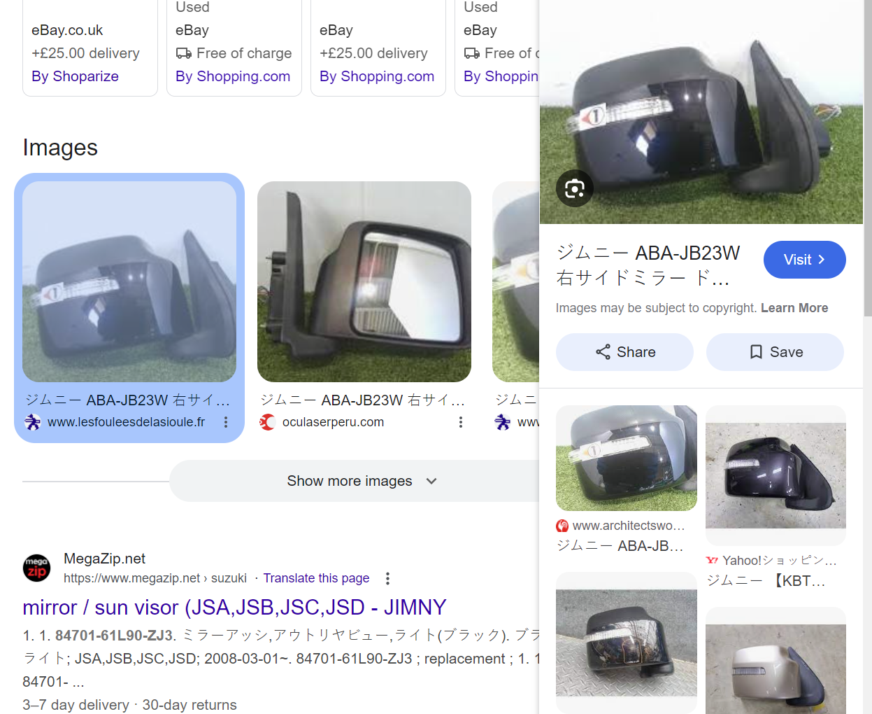 Is it possible to find the part number on the assembly and if so where would I find it? Alternatively does anyone know where I can find parts catalog diagram for this particular model? The one listed on amayama for JB43W-(5) doesn't seem to match my car, eg the diagram for the hood ( www.amayama.com/en/genuine-catalogs/epc/...162_jb43w-5/body/573 ) doesn't match the hood on my car. Alternatively do you think if i purchase this mirror (see attachment for ebay photo) i can use the gears in that mirror to fix my current mirror? It's all rather confusing for me. Any advice would be greatly appreciated.