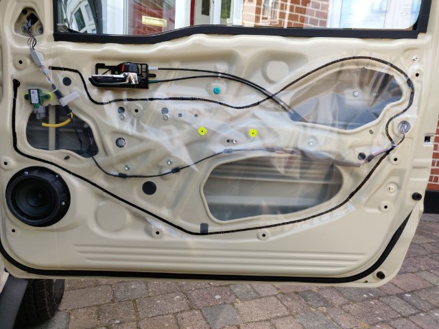 The only tricky part of the upgrade is pulling the door trim off. Always a bit nerve wracking, but once you know where the fixing points are, straightforward. First remove the two Philips screws below the door handle and one screw in the door release recess, indicated in the picture below.
