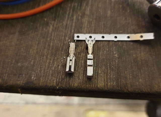 The crimp connector to use in the connector is not the normal bought from car spares shop small terminal. It is more slimline and squarer in cross-section.The one on the left is too big to fit in the block, luckily, I had some of these on the right from a previous project. That fitted with a bit of manipulation, so I’m not sure what the perfect terminal part number would be.