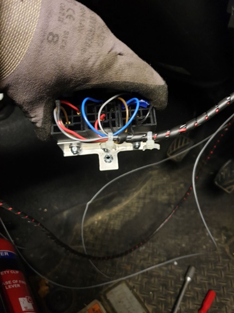 My second attempt at finding a suitable location for the relays worked out well, just behind the pull-out panel by the driver’s right knee (RHD model).A little bracket I made from some 25mm L section ally.