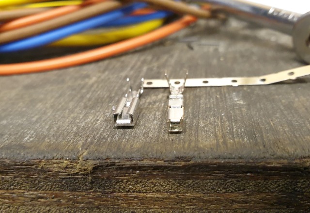 The crimp connector to use in the connector is not the normal bought from car spares shop small terminal. It is more slimline and squarer in cross-section.The one on the left is too big to fit in the block, luckily, I had some of these on the right from a previous project. That fitted with a bit of manipulation, so I’m not sure what the perfect terminal part number would be.