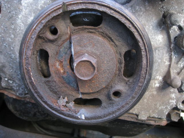 I suspect a previous owner had been driving through water- just look how corroded the pulley was. The flange on the bolt had rusted solid to the pulley, once the flange was off it lost its tension and there was nothing holding it so I undid it with my fingers.