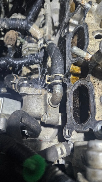 Anyway, where I left off last time I posted was reassembling everything with new parts and seeing what happened. I proceeded to do so and what I saw really slacked me off. Filled with water, cranked it up and watched as all the water disappeared onto the ground. Photo below shows what was happening once I pressure tested it with intake removed ( again ).
