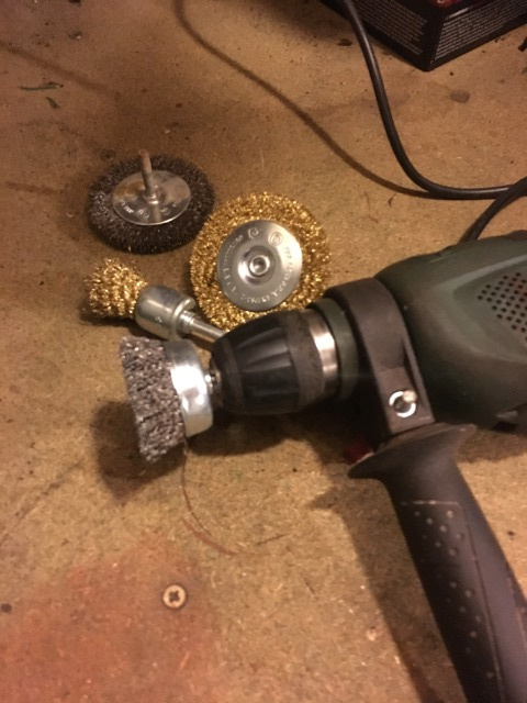 Thankfully the wheels bar one were in good condition. So after about an hour with a drill with some wire brushes and the wheels are ready for some primer and paint tomorrow.