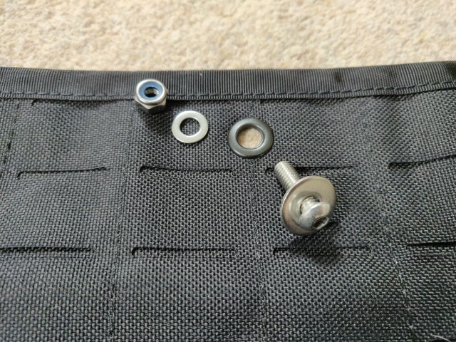 The panel attaches to the rear door trim via 8 hexbolts, so you'll need to remove the panel and drill some holes. They supply a good quality bunch of fittings. 12 dome head hexbolts with large face washers, smaller backing washers and nylock nuts. The bolts go through metal eyelets in the panel.