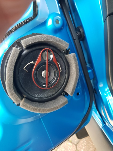 The all black speaket pictured is the stock speaker in its original mount. The other more colourful speaker is the 3 way pioneer.